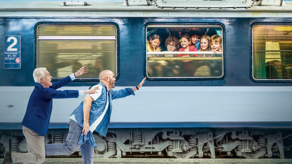 Мужчины отстают от поезда, в котором осталась группа доверенных им детей. Андре Дюссолье в роли дедушки-оторвы