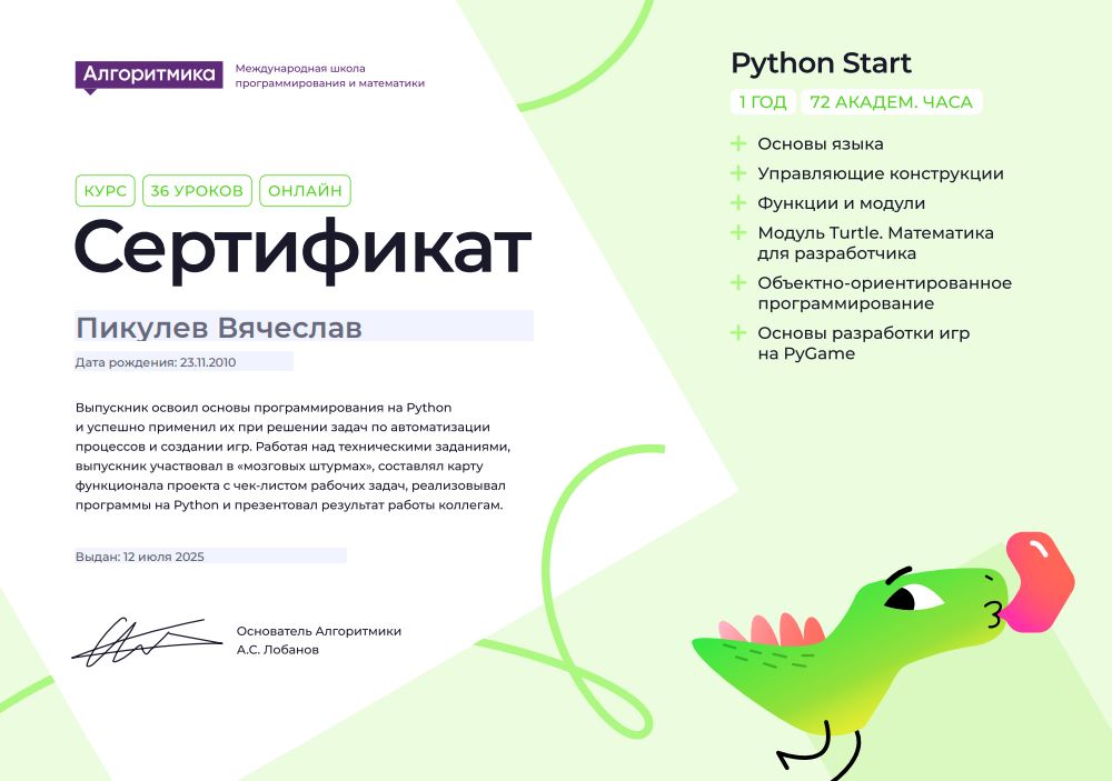 Хочу выразить огромную благодарность онлайн-школе "Алгоритмика" за прекрасные два года обучения, которые мой средний сын, Георгий, провёл и продолжает проводить с вами!