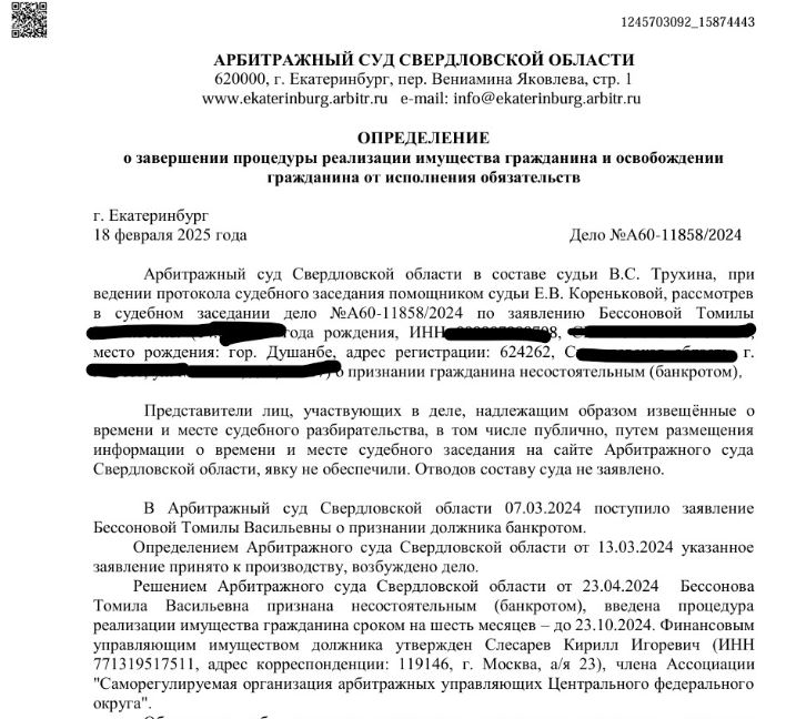 С таким доходом пришлось взять кредиты на благоустройство семьи, иначе бы не вышло, сами понимаете. К сожалению, погасить то, что брала и накопилось после не смогла. Судовой процесс, конечно, длился долговато. С декабря 2023 до февраля 2025. Но главное, что все получилось и теперь я свободна от долга и кредита. Те, кто действительно нуждается в такой помощи смело могут обращаться сюда, сама пришла по совету знакомых, и хочу сказать, что компания действительно знает и умеет, как решить ваши проблемы по банкротсву.