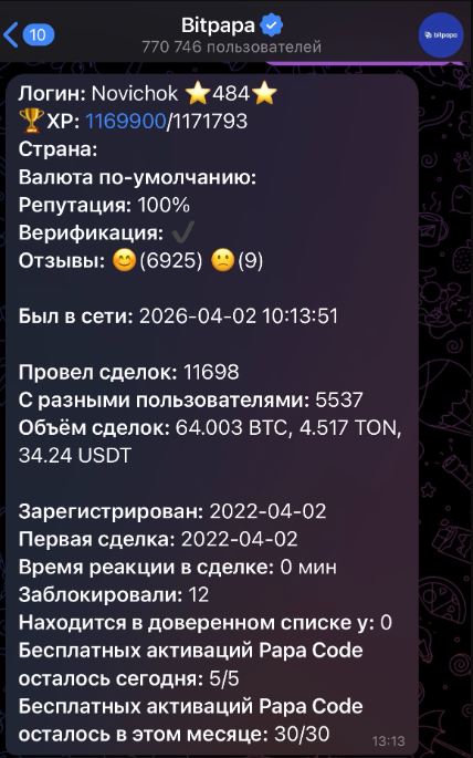 Пользуюсь Bitpapa уже больше года, и пока всё устраивает. Искал надежную P2P-биржу без жесткой обязательной верификации, чтобы можно было быстро покупать и продавать USDT и BTC — нашел именно то, что нужно.