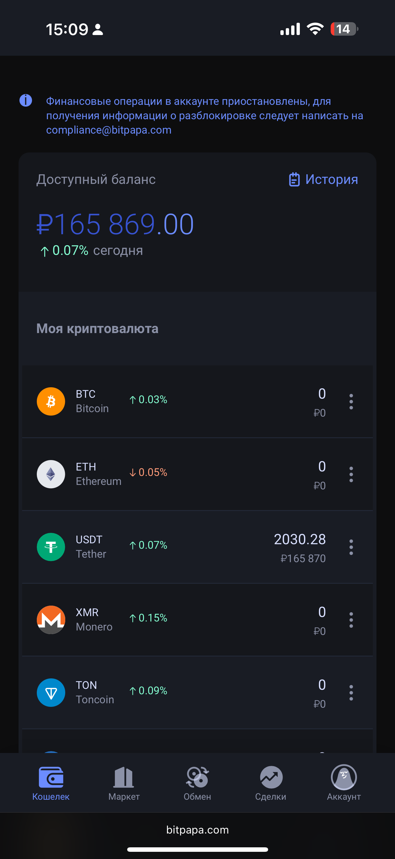 Биржа Bitpapa безосновательно удерживает мои деньги. Застряли 2030 USDT на одном аккаунте, а еще 1551 USDT – на другом аккаунте моего коллеги после отправки на Bybit, где средства также были заморожены из-за санкций против Bitpapa. Общие потери составляют 3581 USDT. Поддержка просто присылает шаблонные ответы: «Владельцы карт должны зарегистрировать аккаунты, пройти верификацию личности и связаться с нами по почте support@bitpapa.com».