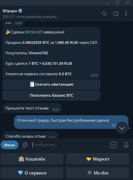 удобный минималистично-прктичный телеграм бот, быстро надо принять отправить снять крипту ? заходишь в тг бот раз два и готово, отличный p2p маркет РФ, продавцы покупатели на уровне, техническая поддержка сервиса работает слаженно отвечает незамедлительно