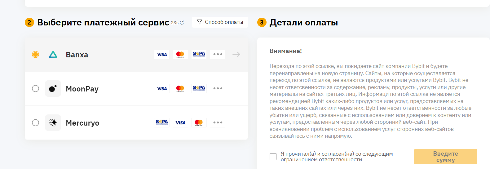 Для пополнения счета через шлюз клиент переходит на сторонний сайт, за дальнейшие его действия криптобиржа ответственности не несёт, поэтому нужно подписать соглашение об отказе от ответственности Bybit, если клиент с ним согласен. В соглашении также указывается, что представленные шлюзы не являются рекомендованными криптобиржей.