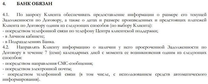 Рассмотрим этот документ на предмет интересных пунктов, в которых могут быть прописаны условия, не указанные на сайте. В целом договор юридически стандартен, но есть ряд интересных моментов. Во избежание конфликтных ситуаций следует обращать внимание на пункт договора, в котором прописано, как именно банк имеет право информировать клиента в различных случаях, в том числе и в момент возникновения у него задолженности по карте. Согласно Правилам, банк имеет право направлять сообщения путем sms-сообщений, по электронной почте и телефонным звонком на личный номер клиента (а не на рабочий или домашний).