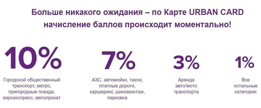 Для держателей кредитной карты «URBAN CARD» у банка подготовлена очень интересная бонусная система. Прежде всего, привлекает внимание то, что самый большой кешбэк — 10 и 7% начисляется за оплаченный по карте проезд в городском транспорте и услуги проката.