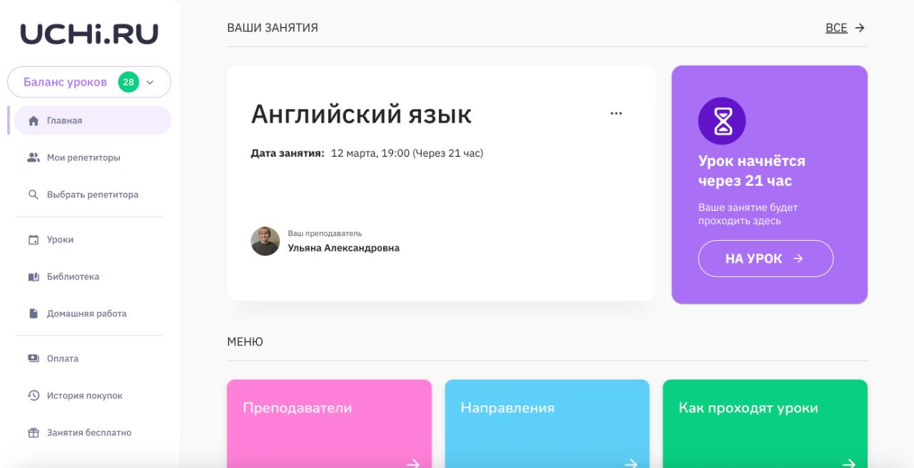 Ребенок занимается в учи дома по трем предметам, мне удобно, что никуда возить не нужно. Подобрали преподавателей с большим опытом, объясняют доходчиво, за три месяца подтянули оценки в школе. На платформе ребенок уже чувствует себя как рыба в воде, сам заходит на урок, сам делает дз, моё участие минимально… Читать далее