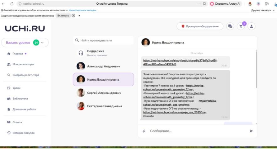 Искали репетитора по математике в экстренном режиме — нужно было срочно подтягивать знания для ОГЭ. Случайно увидели предложение в ВКонтакте с тремя бесплатными уроками от Тетрики (Учи.Дома). Решили, что ничего не теряем, и попробовали.