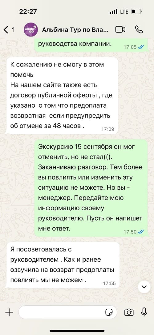 Накануне перелета во Владивосток мой муж попал в реанимацию, и мы были вынуждены остаться в Южно-Сахалинске еще на целый месяц. Я сразу же предупредила гида Дениса о проблеме, но он сказал, что возврат предоплаты невозможен, так как Эмиль — преподаватель, он отменил лекции и ему надо компенсировать неустойку. Чтобы хоть как то использовать предоплату, я передала одну экскурсию ( до начала которой 3 дня) своим друзьям. Каково же было мое удивление, когда мои друзья сообщили, что Эмиль — водитель, который все знает только о Золотом мосте ( работал там в охране), в настоящее время учит детей рисованию, а по вопросам истории Владивостока и его достопримечательностям не владеет никакой (!) информацией((((. Денис мог отменить экскурсию, но не стал, чтобы "заработать". ВЫВОД: компания GuideGo передает заказы своим "партнерам" и не берет на себя ответственность за НЕКАЧЕСТВЕННУЮ работу. Лучше нанять такси, составить самостоятельно маршрут и сохранить свои деньги.