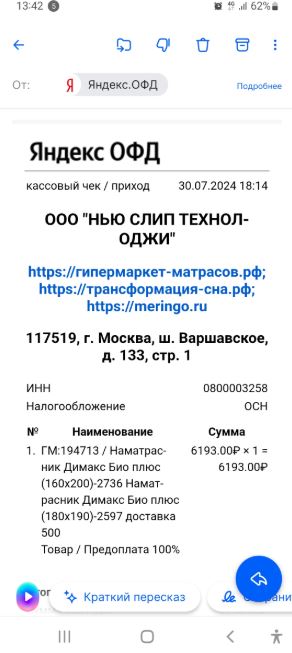 Походу магазин закрылся, что очень и очень жаль! Купила несколько матрасов, накидок защитных, качество отличного все товары до сих пор!!!( с 2020-2021года( матрас), 30.07.24(маирас и 2 накидки).