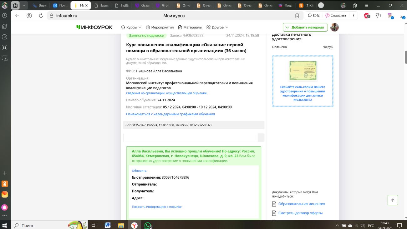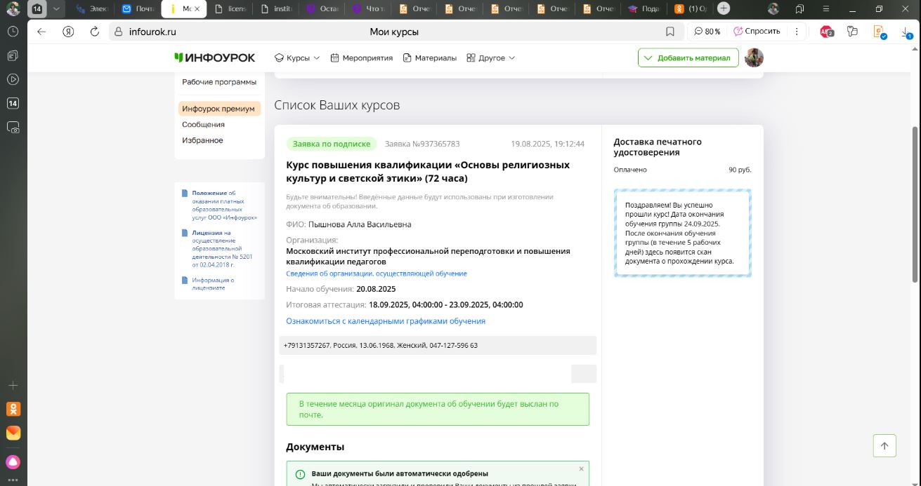 В 2025 году на образовательной платформе "Инфоурок" я проходила курс повышения квалификации. Выбрала этот курс сразу, т.к.цена приятно удивила и сроки оказались приемлемыми. Хотела бы выразить благодарность всем организаторам этой образовательной платформы. Все работает отлично. Спикеры — профессионалы… Читать далее