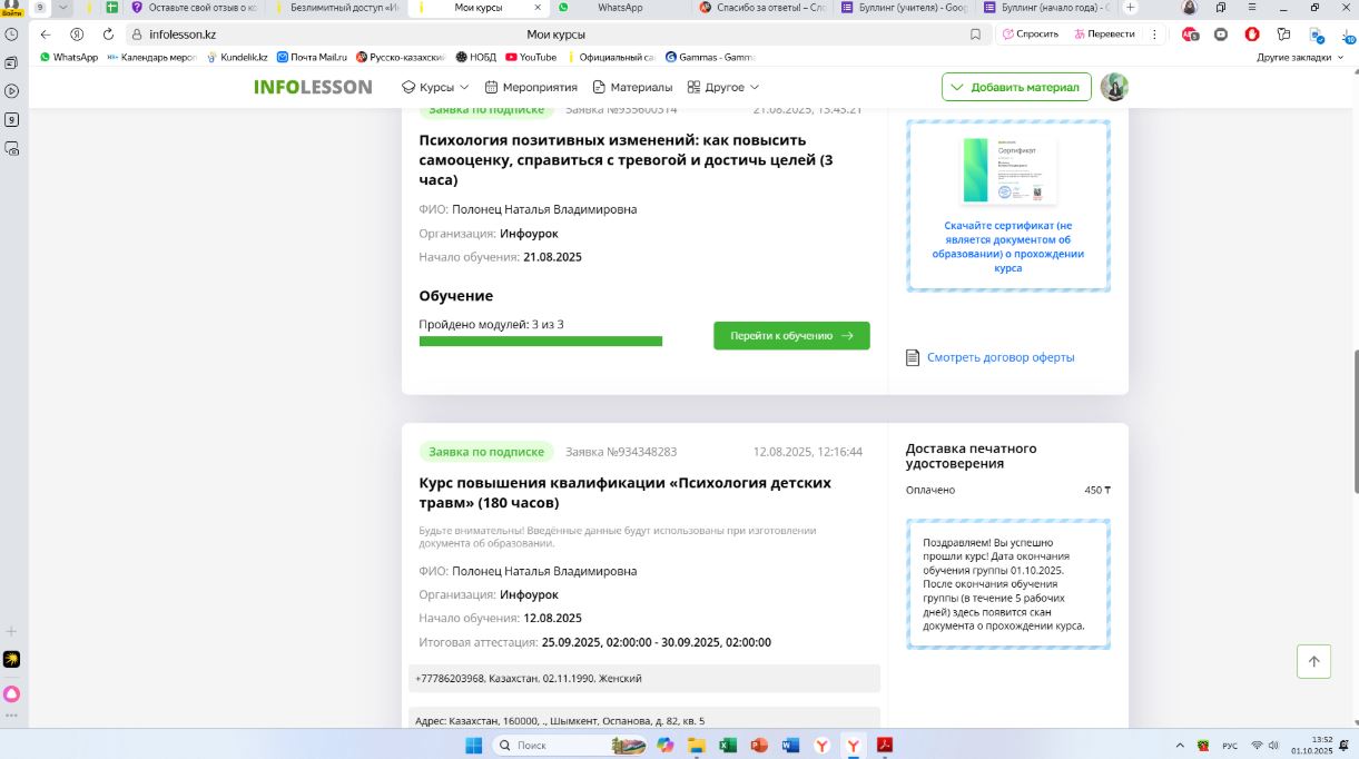 С 2020 год, ежегодно, , а иногда и ежемесячно прохожу курсу, вебинары, семинары и т.д. на ИНФОУРОКЕ. Доступные цены, отличный материал, современные подходы преподавания. А главное очень удобно, что можно проходить в любое время в любом месте где вам удобно. Так же часто участвуем с детьми в онлайн-олимпиадах… Читать далее