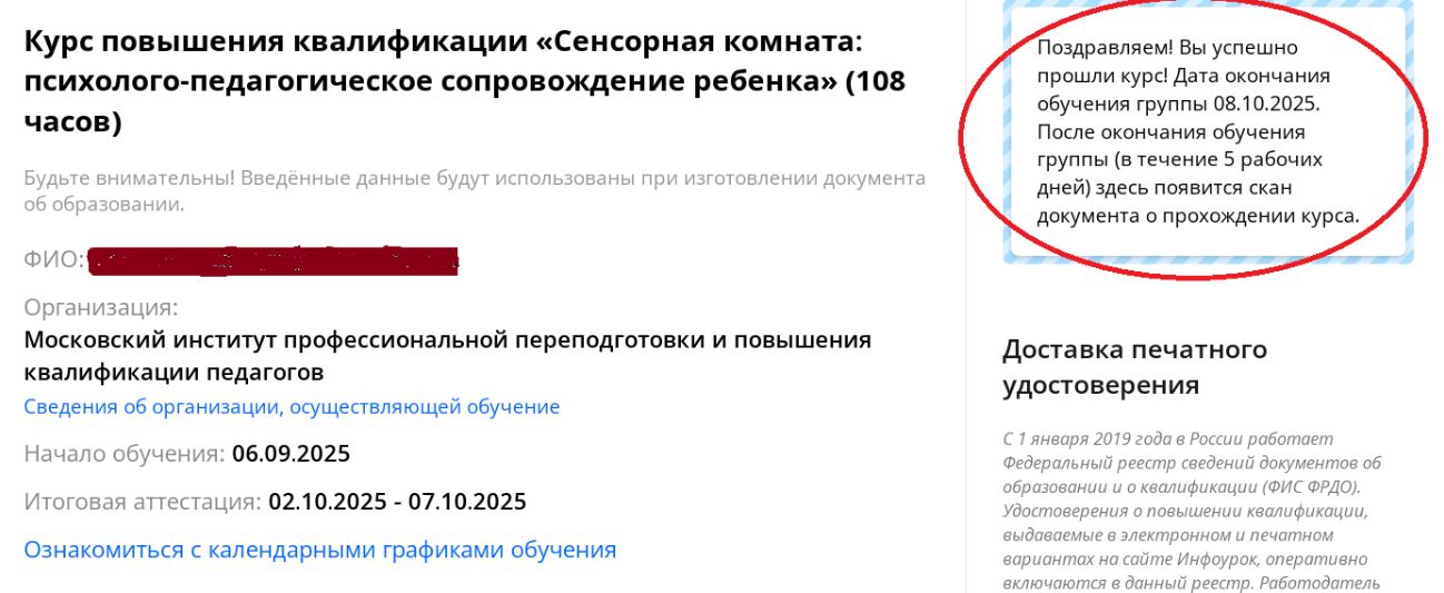 Обучалась на курсе повышения квалификации «Пальчиковая гимнастика как средство развития речи детей дошкольного возраста» (180 часов). Курс мне очень понравился, доступно и просто, всегда можно выбрать время, в которое можно поучиться. уже не первый раз прохожу переподготовку именно в этом институте.