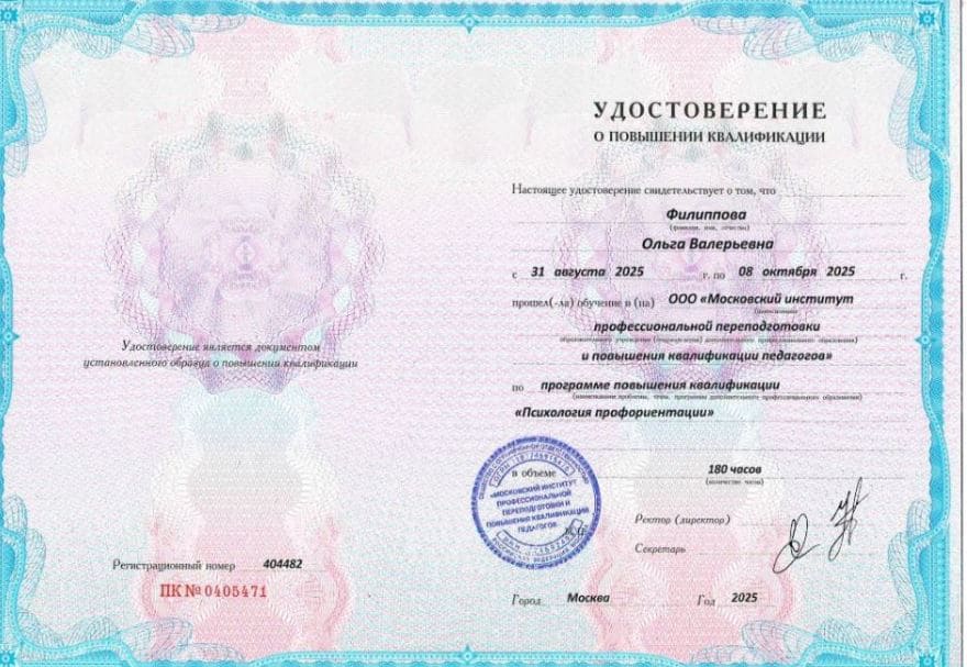 Выражаю искреннюю благодарность организаторам и преподавателям курсов повышения квалификации по теме «Курс профессиональной переподготовки «Организация деятельности педагога-психолога в образовательной организации»».