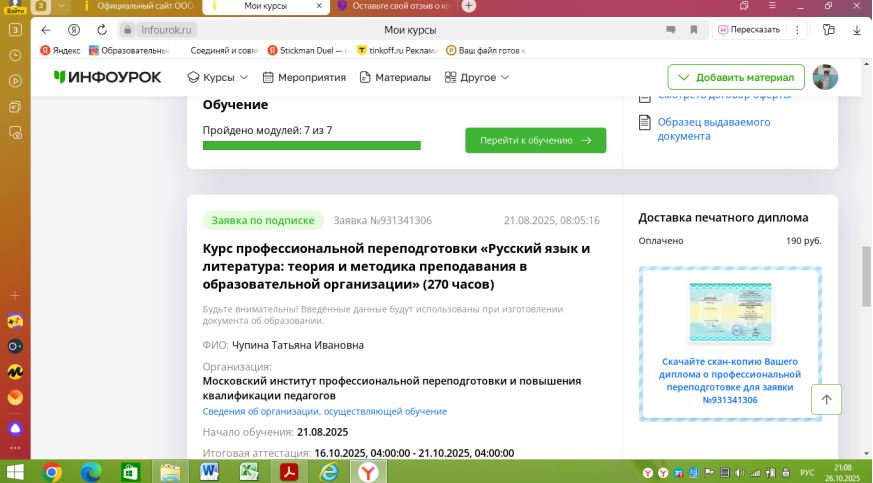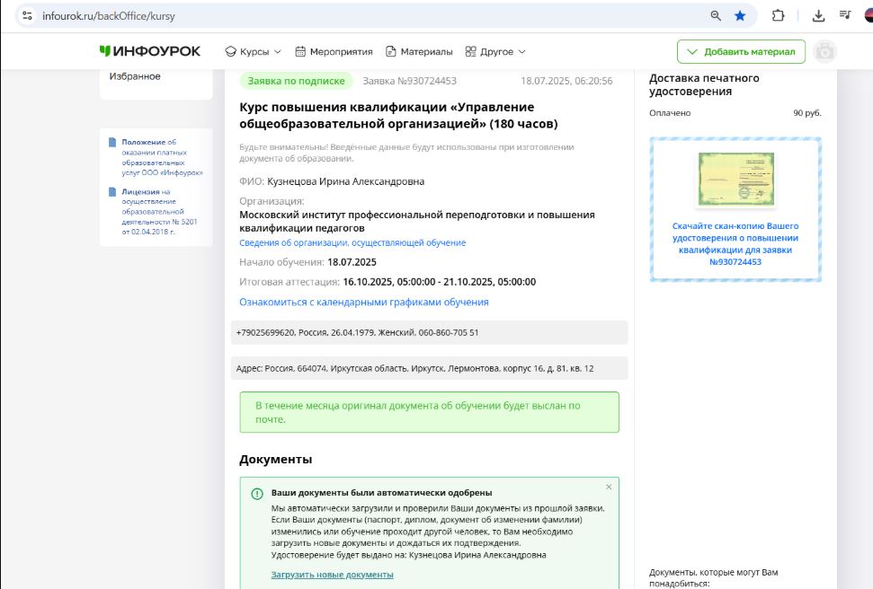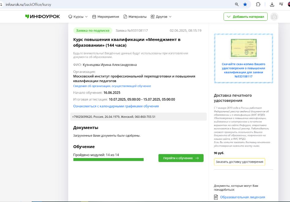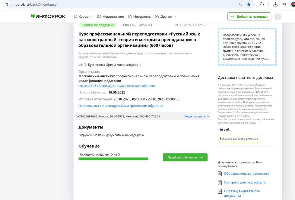 Учебный центр «Инфоурок» оставил исключительно положительное впечатление. Удобная платформа, чёткая структура занятий, возможность учиться в удобном темпе и получать сертификаты государственного образца — всё это делает обучение комфортным и эффективным.