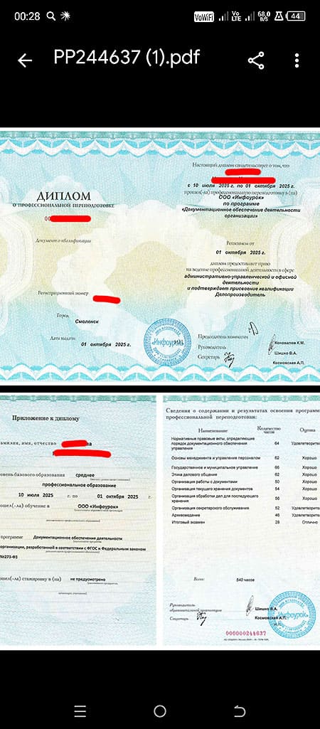 Курс проф переподготовки "Делопроизводитель" прошла. Документы об обученим пришли. Цены на курсы очень приемлемые. Информация доступна, понятна и довольно легко усваемая. Во время обучения была связь с куратором ( не воспользовалась). Очень удобно. Спасибо за возможность учиться не выходя из… Читать далее