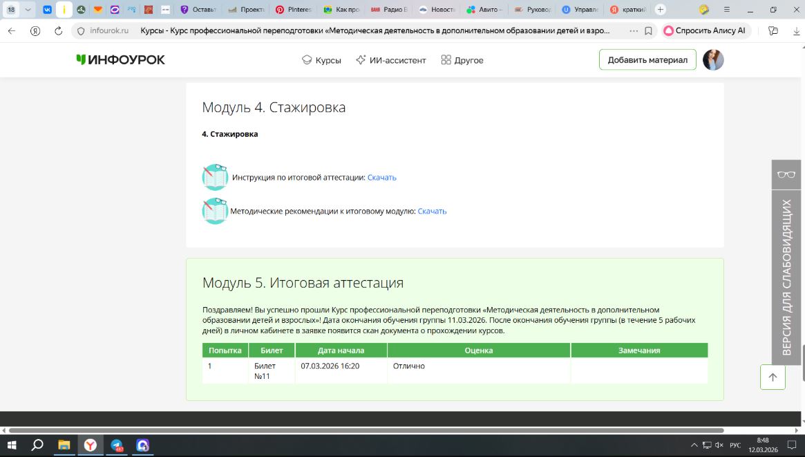 В марте 2026 года прошел курс повышения квалификации, лекции и материал очень доступный, а также возможность практически проверить полученные знания и выполнить самостоятельную работу.