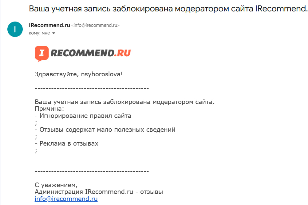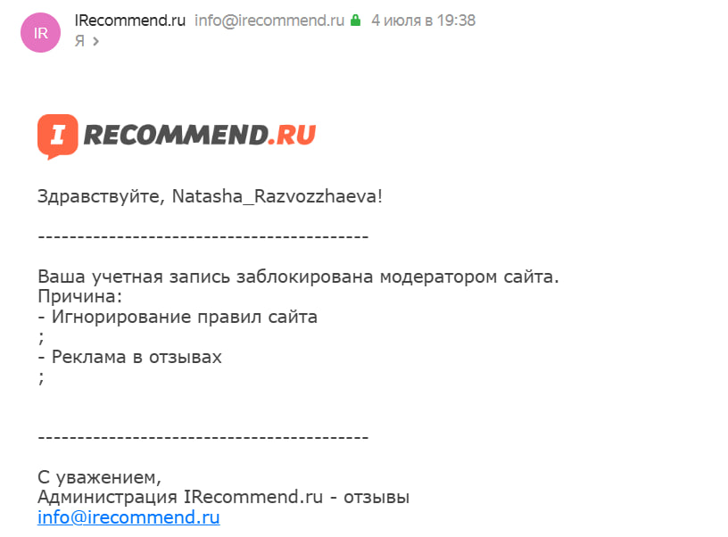 написала положительный отзыв на компанию через сайт IRecommend.ru. до этого было много негативных отзывов, а мой был положительным. В итоге сначала мой отзыв заблокировали, а потом, когда я попросила разъяснений, заблокировали мою учетную запись.