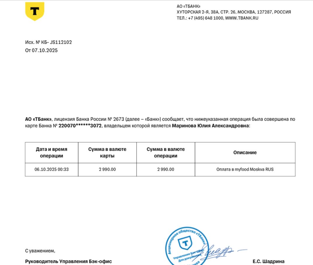 Пользовался услугами компании my food 3 месяца . При последнем заказе (30 дней ) на декабрь ( заказывал доставку заранее на 7.12) заказ привозить отказались сославшись на то ,что заказ не был подтверждён менеджером который якобы не смог мне дозвониться . Никто из компании накануне мне не звонил . Тех… Читать далее