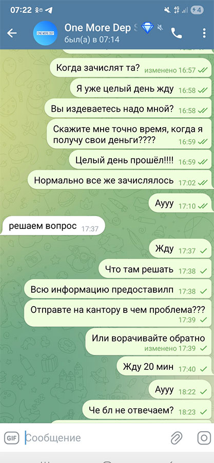 Закинула на кантору через сберб TG бот дал реквизиты пополнила выслала чек алмину и видео как пополняла, все начал меня в игнор кидать… так кантору и не пополнил поддержка ничего толком не объясняет!!! Вторые сутки пошли и так не зачислили на баланс а ажмин ушёл в игнор