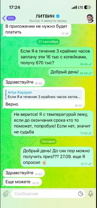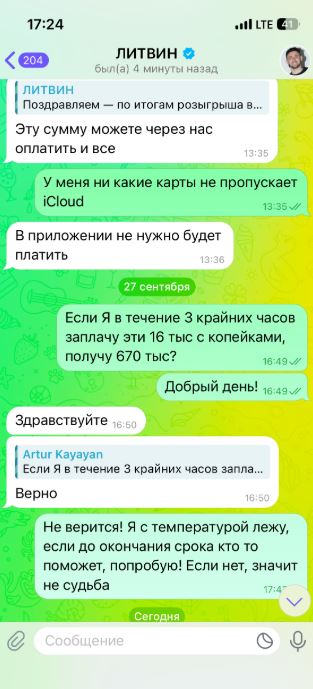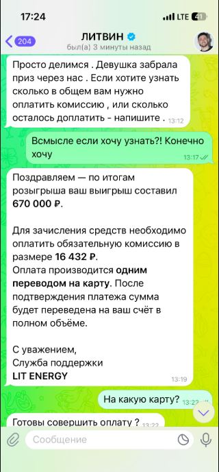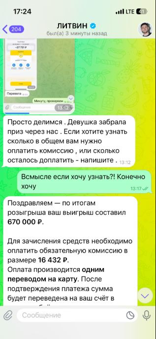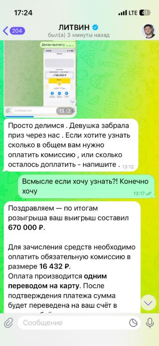 Мошенничество попросили заплатить госпошлину за выйгрш 670 тысяч , не видитесь, компании Литвина должно быть стыдно., что занимаются разводом.