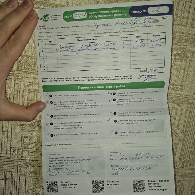 На 30.03.2026созвонились с компанией и запланировали чистку кондиционера, которую должны были провести от компании MIRCLI. Меня перевели на менеджера Даниила ***, который сообщил что в перечень будет входить: