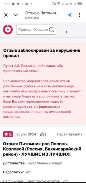 Впервые по совету сына написала отзыв на сайте Отзовик. Они его заблокировали. На вопрос почему — ответ, "писали по заказу". Пыталась обьяснить, что заказа не было, по собственной инициативе. Был долгий диалог выяснений. Но в итоге ультиматум- не опубликуем.!