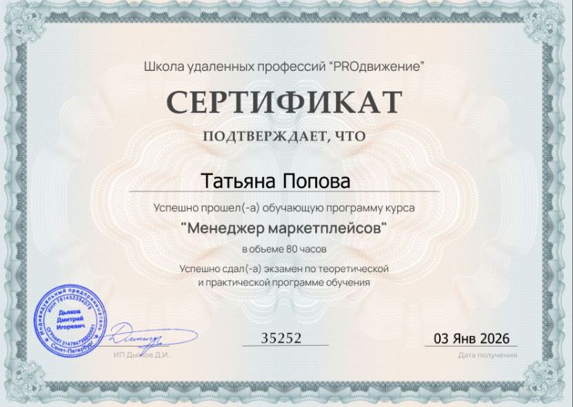 Благодаря курсу я полностью разобралась в алгоритмах ранжирования, научилась профессионально настраивать внутреннюю рекламу и, что самое важное, — считать юнит-экономику так, чтобы бизнес не уходил в минус. Теперь я четко понимаю, как вывести товар в топ и масштабировать продажи. Страх ушел, остался четкий план действий и уверенность в своем профессионализме. Спасибо руководителю школы PROдвижение Дмитрию Дьякову и всей его команде!!!