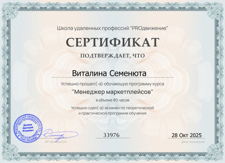 В июле-сентябре 2025 года прошла обучение по курсу «Востребованный менеджер маркетплейсов».