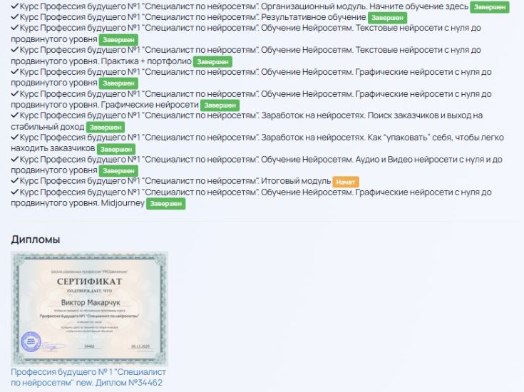 Добрый день! Меня зовут Сергей Кириенко. Я проходил обучение по программе "Профессия будущего №1 "Специалист по нейросетям" школы PROдвижение с 1 сентября 2025. Знаний о нейросетях на тот момент не было совсем. Полный "0". Обучение на курсе расцениваю как создание твёрдого и… Читать далее