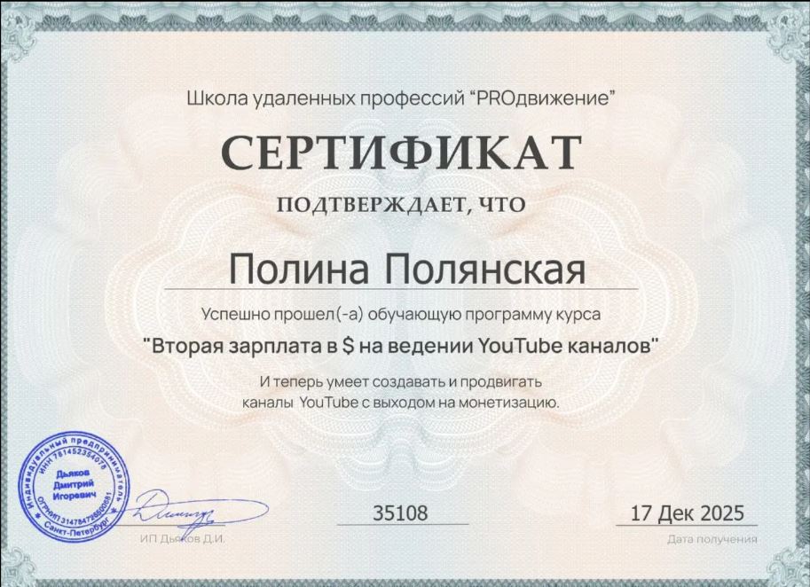 Прошла курс «Вторая зарплата в $ на ведении YouTube-каналов» в онлайн-школе PROдвижение. Целью было получение практических навыков для создания и монетизации контента на международной арене, что особенно актуально в современных реалиях.