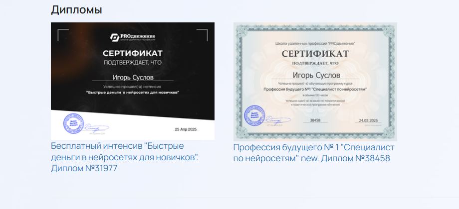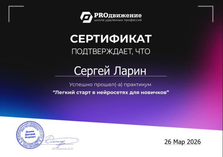 В период с 2025 по 2026 годы я прошла обучение в школе PROдвижиение по курсу «Профессия будущего №1: Специалист по нейросетям». Данная школа имеет лицензию Министерством образования и науки, стабильно входит в топ-1% лучших онлайн-школ России и дважды становилась лауреатом премии «Онлайн школа года»… Читать далее