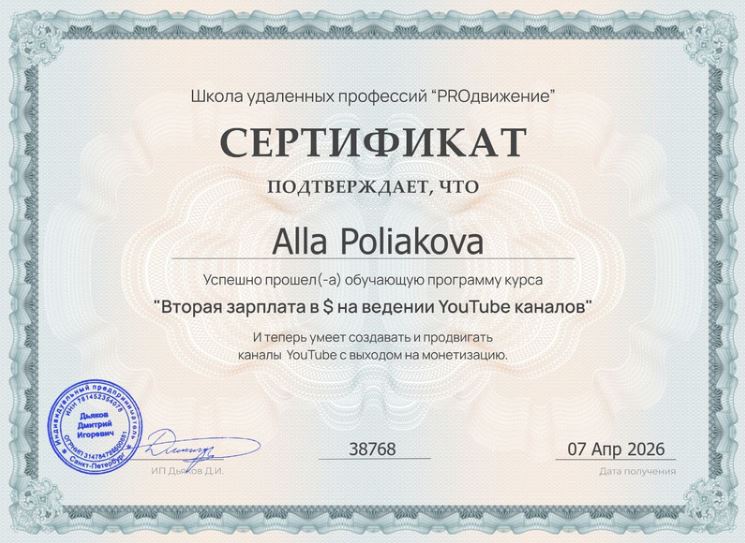 Прошла курс "Вторая зарплата $, на ведении YOUTUBE канала!!!"