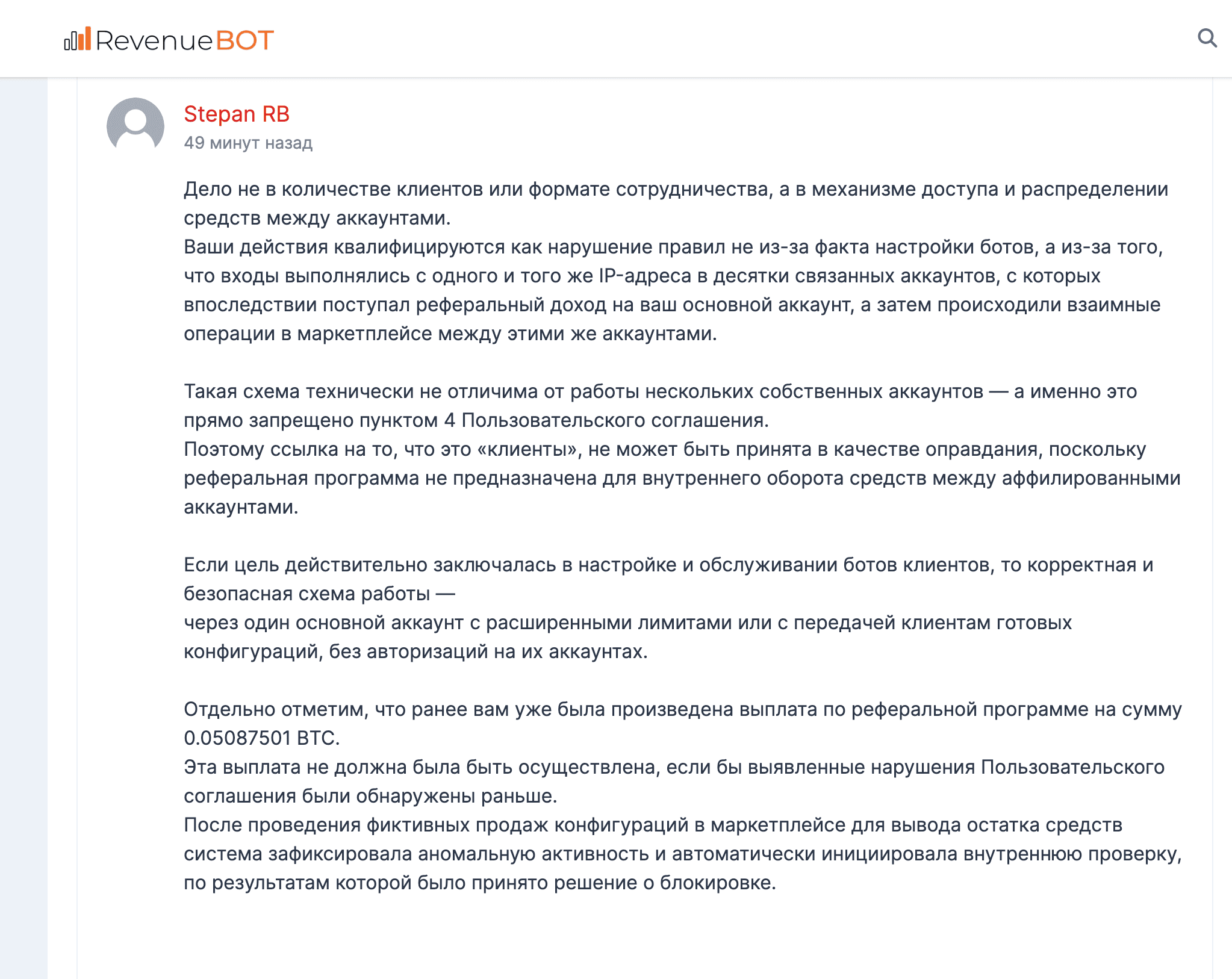 Что касается причины блокировки, она подробно описана в Пользовательском соглашении RevenueBot: