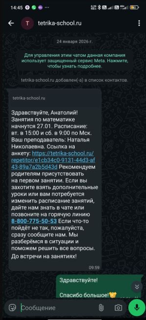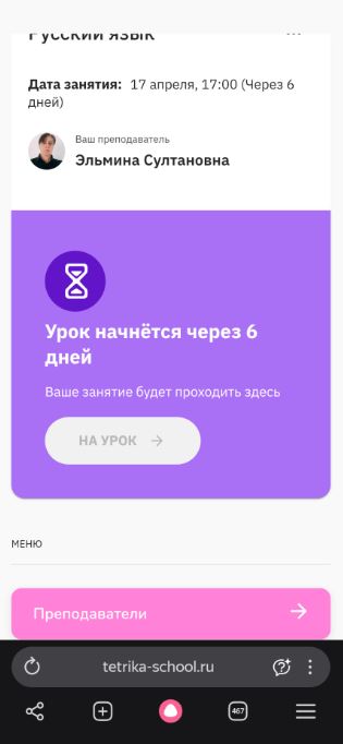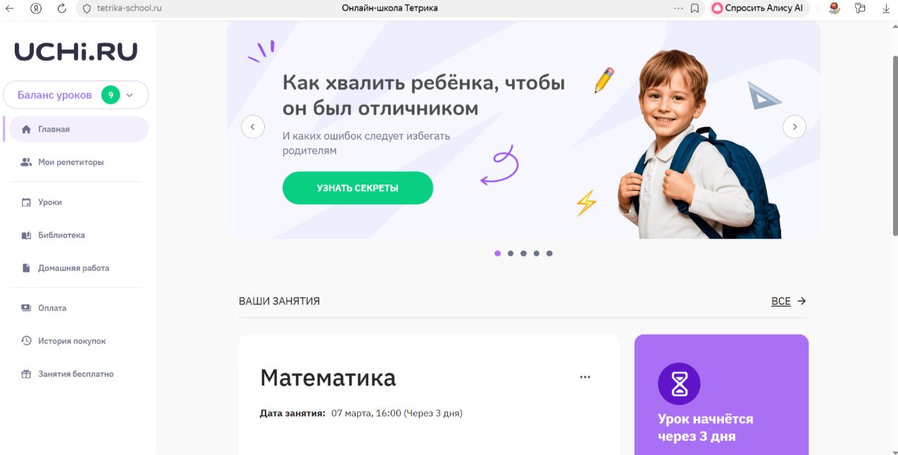 Тетрика-Замечательная школа. Дочь раньше никогда не занимался с преподавателями онлайн, решили попробовать, подтянуться по русскому языку. При первом знакомстве увлекли и заинтересовали так, что все сомнения сразу развеялись. Выбрали преподавателя, занимается, ждет каждый урок, появилась уверенность.