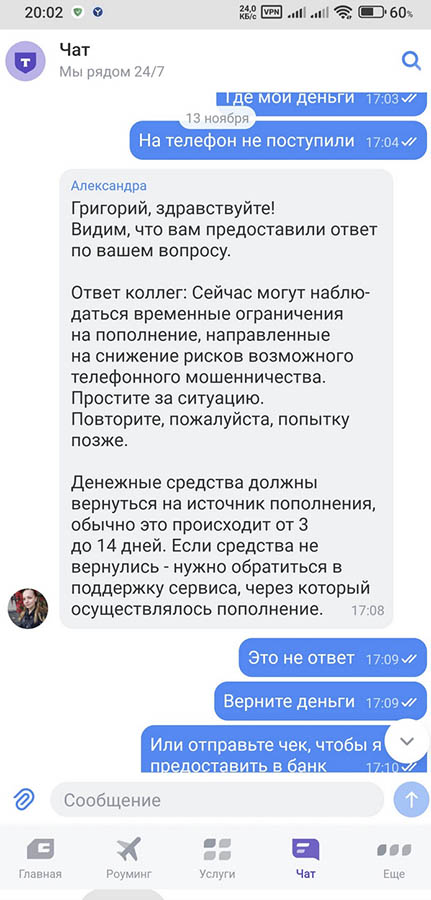 Здравствуйте, хочу рассказать свою историю про использование связи Т мобайл или как ранее Тинькофф мобайл. Положил деньги на баланс телефона 2024.50 рублей, но деньги не пришли на баланс.