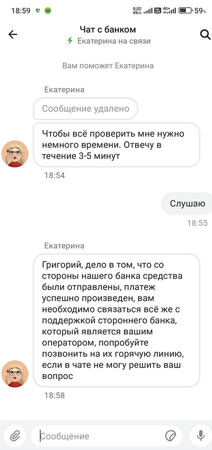 Прошло несколько часов, денег нет и начал писать оператору, в чат подерку Тинькофф банка и мне ответили интересной отпиской…