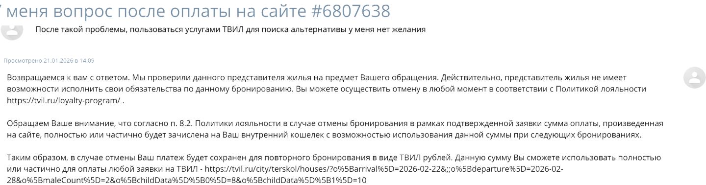 Я забронировал аренду дома, почти сразу со мной связался хозяин и сообщил что дом на эти даты уже забронирован, но у оператора ТВИЛ это не отобразилось. Более того — они самостоятельно от лица хозяина подтвердили мне бронь.