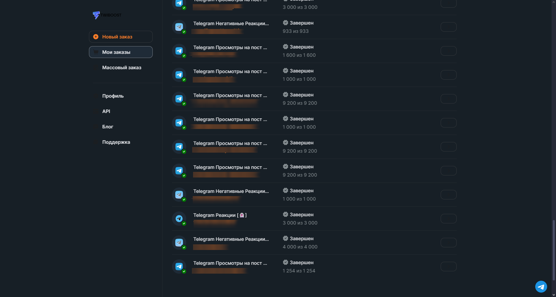 Мне посоветовали этот сайт Twiboost, ну я и решил крутить там. Сначала крутил себе на телеграмм канал, реакций и просмотры. Все заказы выполнялись не больше часа, независимо от количества. Потом узнал что там есть api, а это отлично, я привязал его к боту и начал иметь с этого еще и прибыль.
