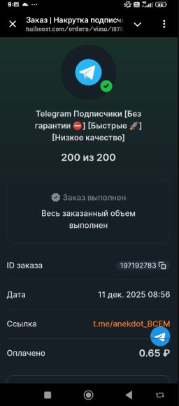 Сервис, который даёт результат за копейки! Недавно воспользовался Tutiboust для привлечения подписчиков в Telegram и получил ровно то, что нужно: быструю и эффективную накрутку. Заказал 200 подписчиков по тарифу «Быстрые» — и всё действительно пришло почти моментально. Да, качество указано как низкое, но для создания видимости активности и социального доказательства это идеальный вариант. Весь объём выполнен полностью, никаких списаний или недобора. Цена поражает — всего 65 копеек за такую массовую подписку! Интерфейс сервиса простой и понятный, статус заказа отображается чётко. Если вы ищете недорогой способ быстро поднять численность аудитории для нового или малоактивного канала — Tutiboust станет отличным выбором. Быстро, честно, без переплат.
