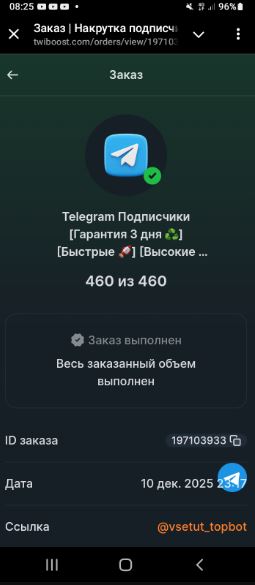 Процесс оформления заказа оказался очень простым и интуитивно понятным, что является большим плюсом для любого пользователя. Навигация по сайту не вызывает никаких затруднений, и вся необходимая информация доступна в полном объеме. После оформления, я ожидал выполнения, и могу сказать, что сервис превзошел мои ожидания. На странице заказа четко видно, что выполнение произошло 10 декабря 2025 года, и что самое главное — весь заявленный объем был выполнен в точности. Я получил ровно 460 подписчиков из заказанных 460, что подтверждает статус "Заказ выполнен".