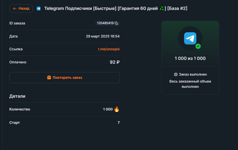 Узнал о сайте на форуме, решил попробовать накрутить себе 1к подписчиков на тгк, остался доволен, всё пришло быстро висят с марта без отписок, буду брать еще.