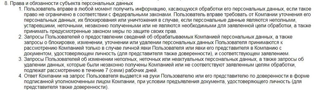 Указано, что согласие на обработку данных о клиенте можно отозвать. Для этого надо подать в Молния Займ заявление, написанное в офисе с предоставлением удостоверения личности, не менее, чем за 2 недели до момента отзыва. Если такое заявление будет удовлетворено, компания прекратит обработку персональной информации в течение 3 дней. Также в политике есть список компаний, которым могут передаваться личные данные пользователей, пункт о правах и обязанностях клиентов.